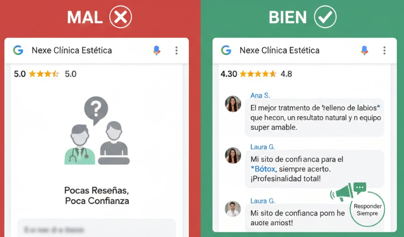 Tener un 4.8 de nota media es mejor que un 5.0 con solo 3 reseñas. Pero en el sector salud, hay dos factores clave: